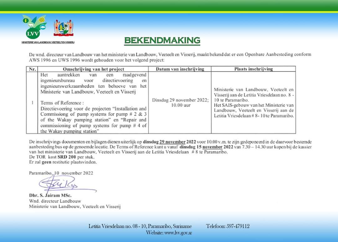 “Dus LVV houdt een eerst aanbesteding om een aannemer aan te trekken en een overeenkomst te tekenen voor de Wakay pompen en daarna wordt een aanbesteding voorbereid om de directievoerder aan te trekken. Bij dit soort grootschalige projecten wordt de directievoerder eerst aangetrokken om het project technisch voor te bereiden. De directievoerder is ook nauw betrokken om de aannemer te beoordelen die ingeschreven heeft bij zulke projecten. Nu rijst nog meer de vraag: op basis van welke normen is het bedrijf Naturata Reliability NV in aanmerking gekomen voor de Wakay pompen? Er is niet eens een infodag ingelast, maar direct een inschrijvingsdag. LVV heeft geen deskundigheid om dat te beoordelen. Daarvoor zou de directievoerder verantwoordelijk zijn, een soort technische beoordeling”, zegt Doekhie.