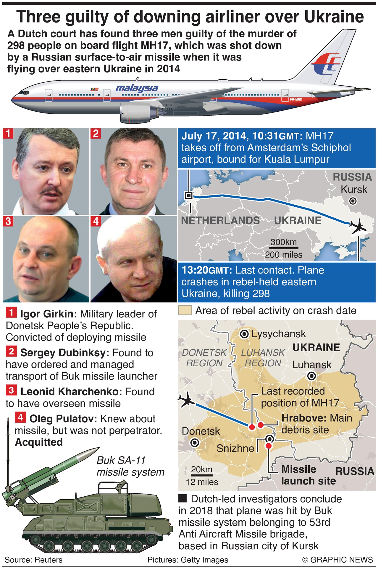 De drie veroordeelde mannen waren voormalige Russische inlichtingenagenten Igor Girkin en Sergey Dubinskiy, en Leonid Kharchenko, een leider van de Oekraïense separatisten. Een vierde, de Rus Oleg Pulatov, werd vrijgesproken.