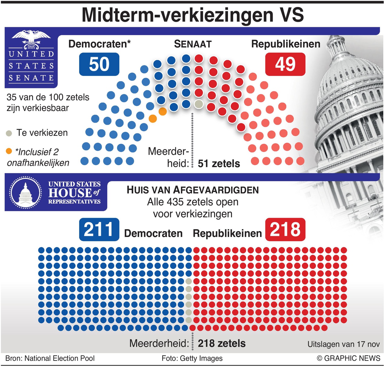 17 november 2022 – Het land is in feite verdeeld: de Democraten behouden minstens 50 stemmen in de Senaat met 100 zetels, terwijl de Republikeinen een krappe meerderheid in het Huis hebben.