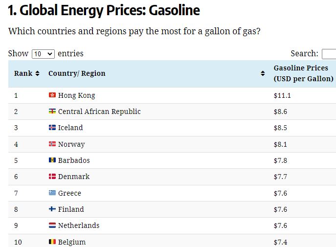 Met een gemiddelde van $ 11,1 USD per gallon betalen huishoudens in Hong Kong het hoogste ter wereld voor benzine – meer dan het dubbele van het wereldwijde gemiddelde. Zowel hoge gasbelastingen als steile grondkosten zijn primaire factoren achter hoge gasprijzen.