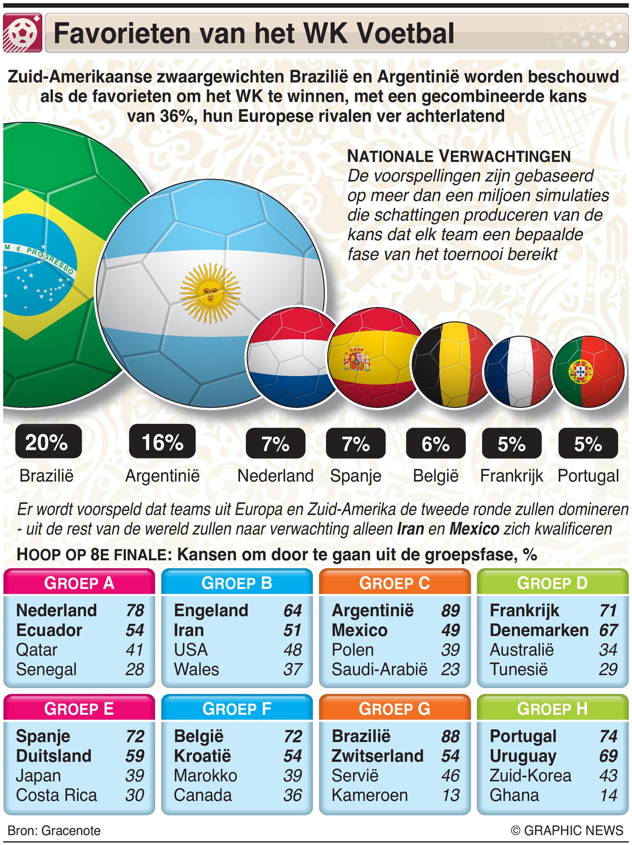 Voorspellingen op basis van een miljoen simulaties door Gracenote – die diepgaande sportgegevens vastlegt, beheert en verspreidt – schat de procentuele kans dat elke WK-wedstrijd een overwinning, gelijkspel of verlies is voor elk van de teams.
