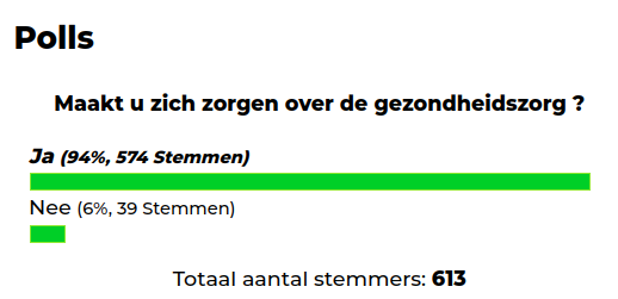 Uit een poll op de website van Dagblad Suriname blijkt overduidelijk, dat de bevolking bezorgd is over de lokale gezondheidszorg. Op de vraag of men zich zorgen maakt over de gezondheidszorg werd maar liefst door 574 van de in totaal 613 personen die de poll invulden, ‘Ja’ aangevinkt, 94%. Slechts 39 personen (6 procent) vinkte de optie ‘Nee’ aan, met andere woorden, zij maken zich geen zorgen over de gezondheidszorg.