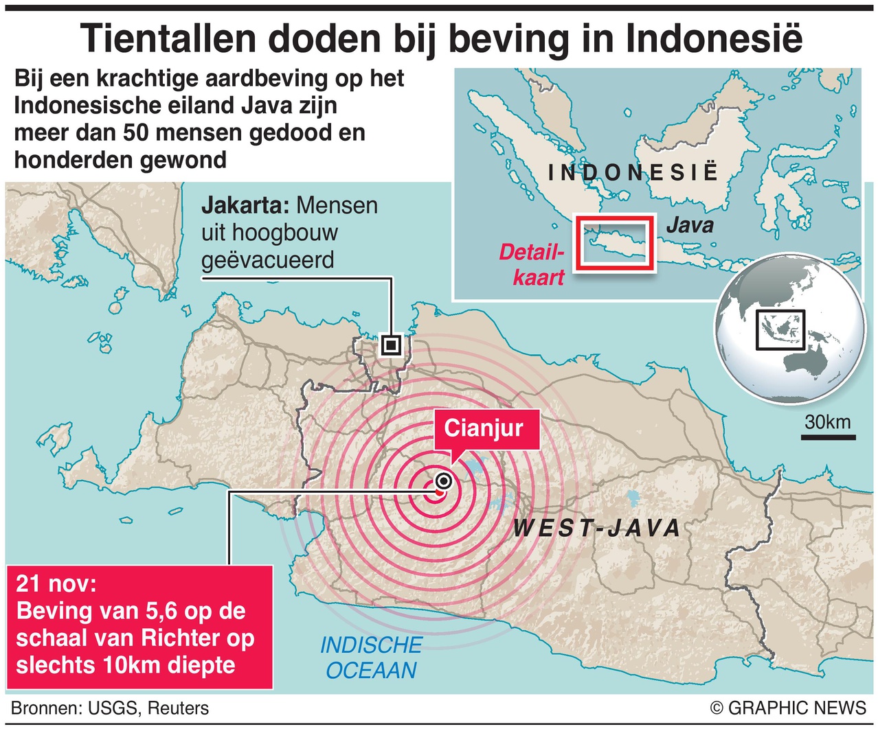 De gouverneur van West-Java, Ridwan Kamil, bevestigde dat er 56 doden zijn gevallen door de aardbeving, waarvan het epicentrum de stad Cianjur was, ongeveer 75 km ten zuidoosten van de hoofdstad Jakarta.