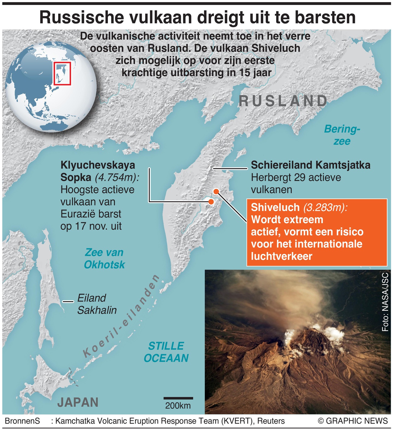 Zes vulkanen op het verre oostelijke Russische schiereiland Kamchatka vertonen momenteel tekenen van verhoogde activiteit, waaronder de Shiveluch en de hoogste actieve vulkaan van Eurazië, Klyuchevskaya Sopka, die afgelopen donderdag begon uit te barsten.