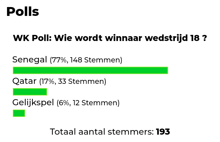 De Afrikaanse kampioenen Senegal nemen het vandaag op tegen Qatar. De Afrikanen leiden de peiling metĀ 148 stemmen (77%)Ā van de in totaal 193 personen die hebben gestemd. Het gastlandĀ kreeg 33 stemmen (17%) en 12 stemmen (6%) gingen naar gelijkspel. Beide landen hebben hun eerste wedstrijd verloren.