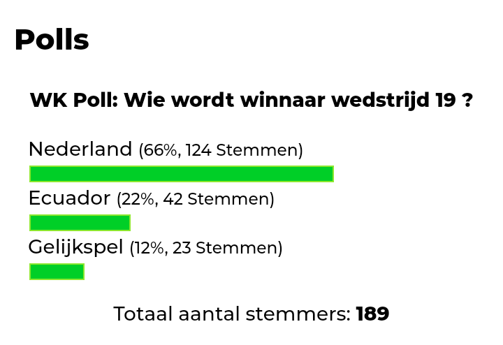 Ecuador kende een makkelijke eerste wedstrijd tegen Qatar, maar nu moeten zij zich kunnen bewijzen tegen een van de beste selecties van het WK, Nederland. Oranje wordt gezien als favoriet vandaag. Maar liefst 124 stemmen (66%)Ā uit 189 uitgebrachte stemmen. Ecuador, dat momenteel evenveel punten heeft als Nederland, kreeg 42 stemmen (22%) en 23 stemmen (12%) gingen naar gelijkspel.Ā