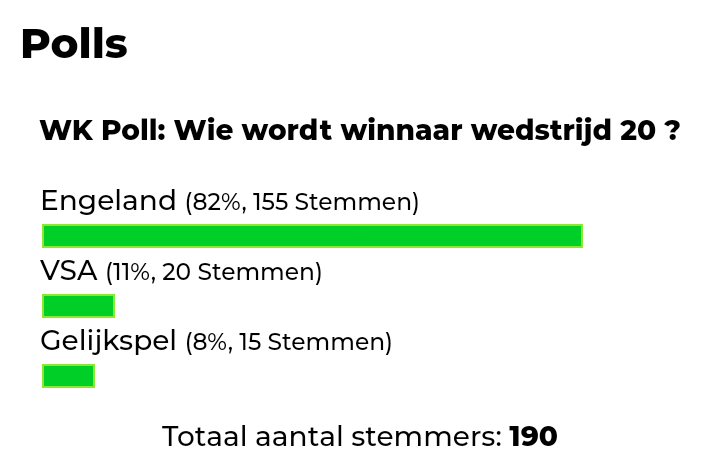 Engeland wordt toch door de stemmende bevolking gezien als een van de favorieten voorĀ de dag. Met 156 stemmen (82%)Ā uit 190, leiden zij de peilingen van deze match. De VS kreeg 20 stemmen (11%) en 15 stemmen (8%) gingen naar gelijkspel.Ā