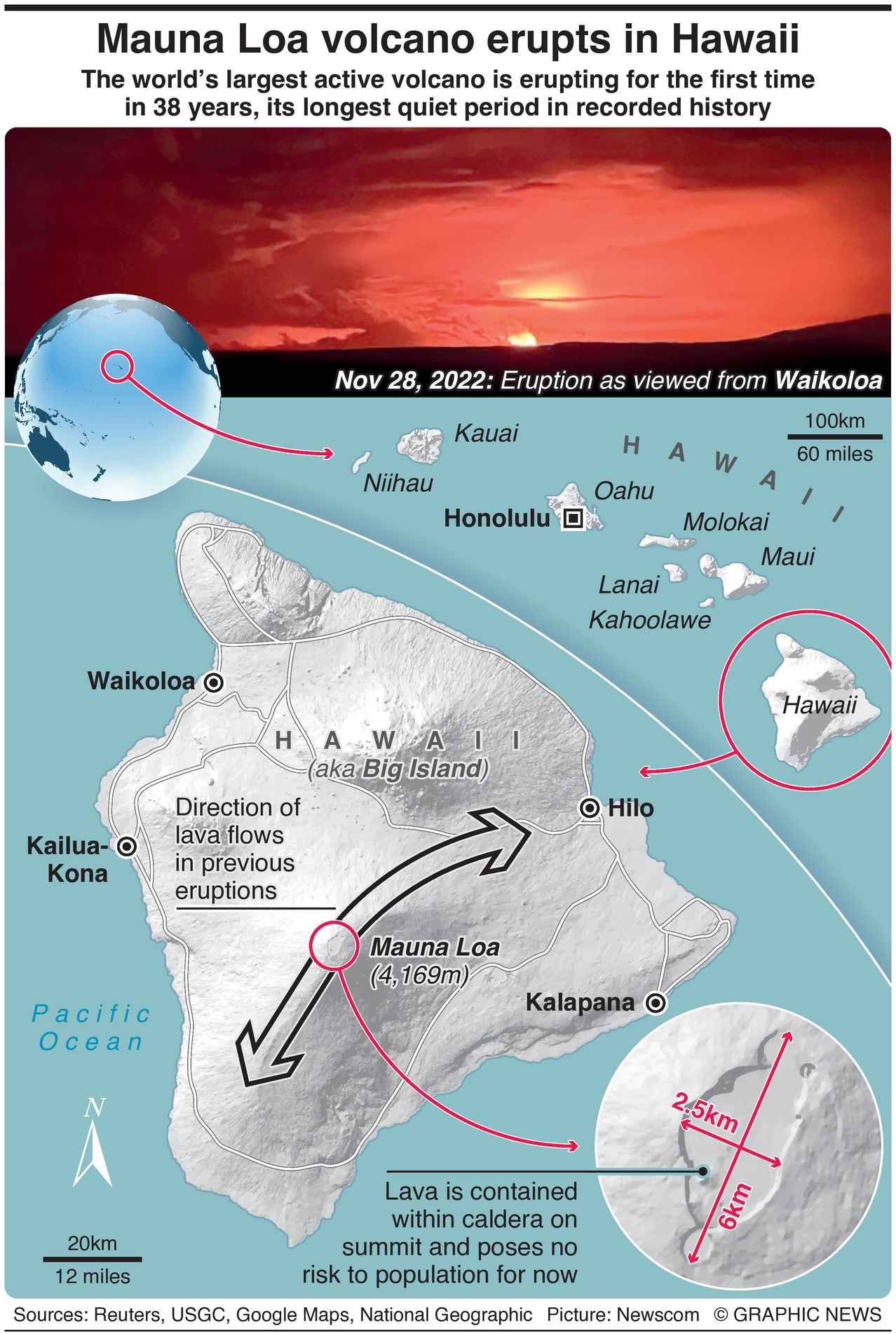 Momenteel bevindt de lava zich in de 6 km lange, 2,5 km brede caldera van de top en vormt geen bedreiging voor burgers, hoewel de U.S. Geological Service (USGS) waarschuwingen heeft afgegeven dat vulkanische gassen en fijne as naar bevolkte gebieden kunnen drijven.