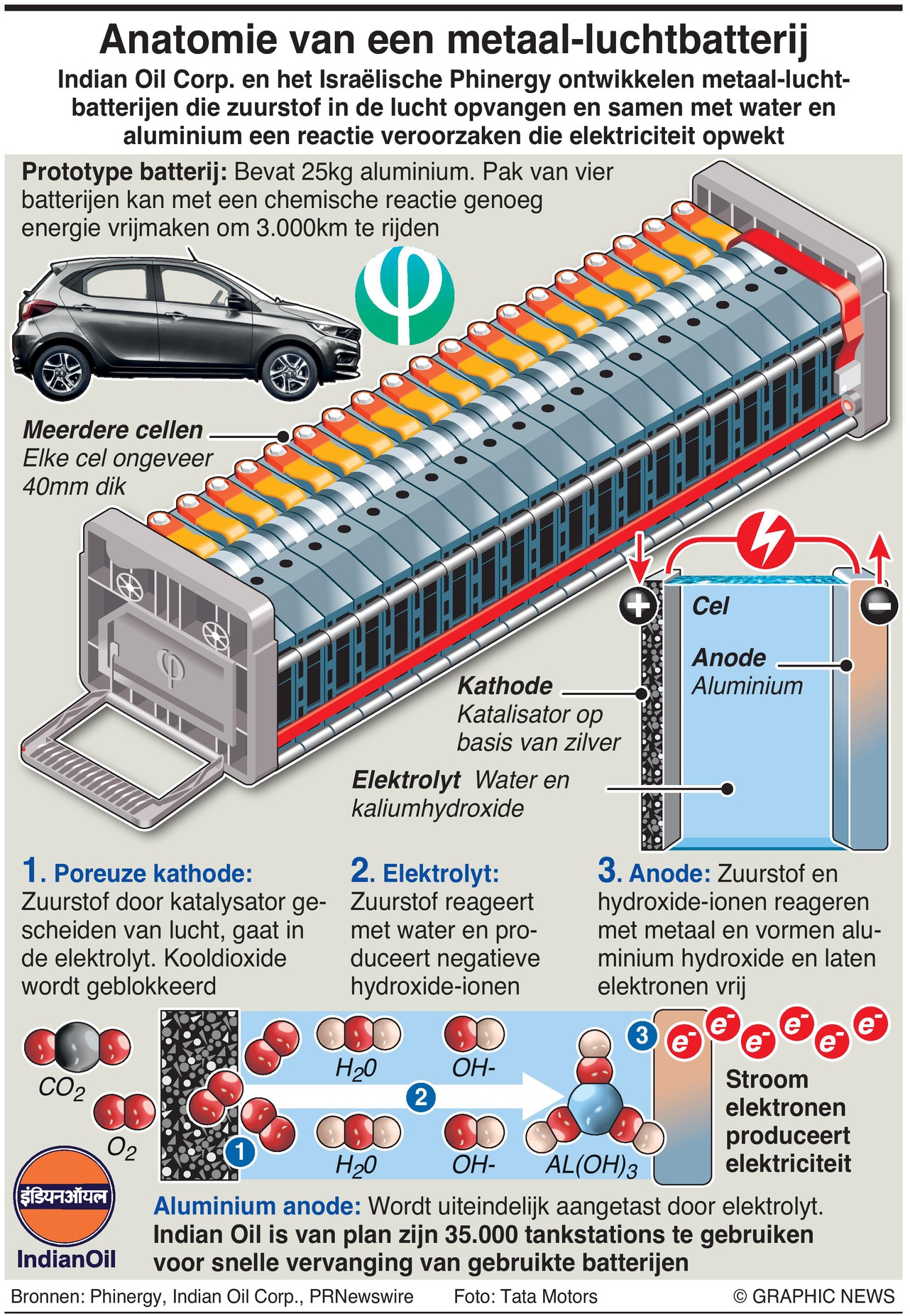 28 november 2022 – Indian Oil Corp. en het IsraĆ«lische Phinergy ontwikkelen metaal-luchtbatterijen die zuurstof in de lucht opvangen en samen met water en aluminium een ​​reactie op gang brengen die elektriciteit opwekt.