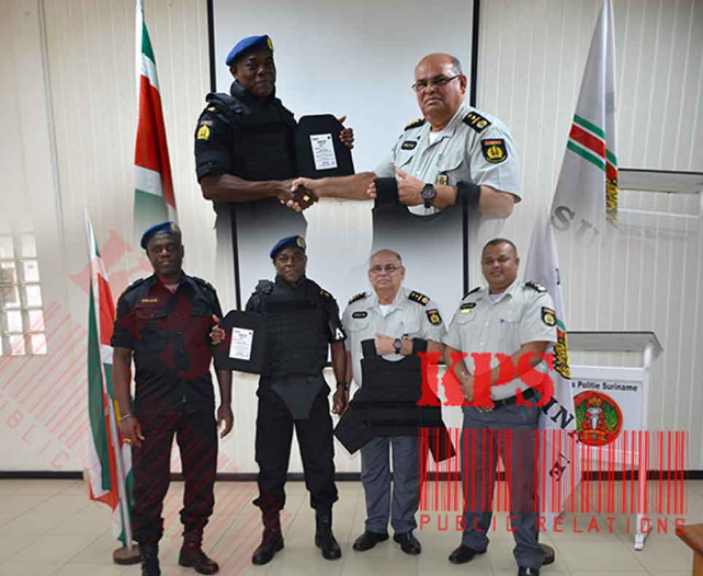 De plaatsvervangend korpschef van het Korps Politie Suriname (KPS), Stanley Changoer, en de directeur Beleidsvoorbereiding en Beheer (BvB), Rishi Akkal, beiden commissaris van politie, hebben maandag 5 december 40 kogelwerende vesten overgedragen aan de structuur Bestrijding Zware Criminaliteit (BZC).