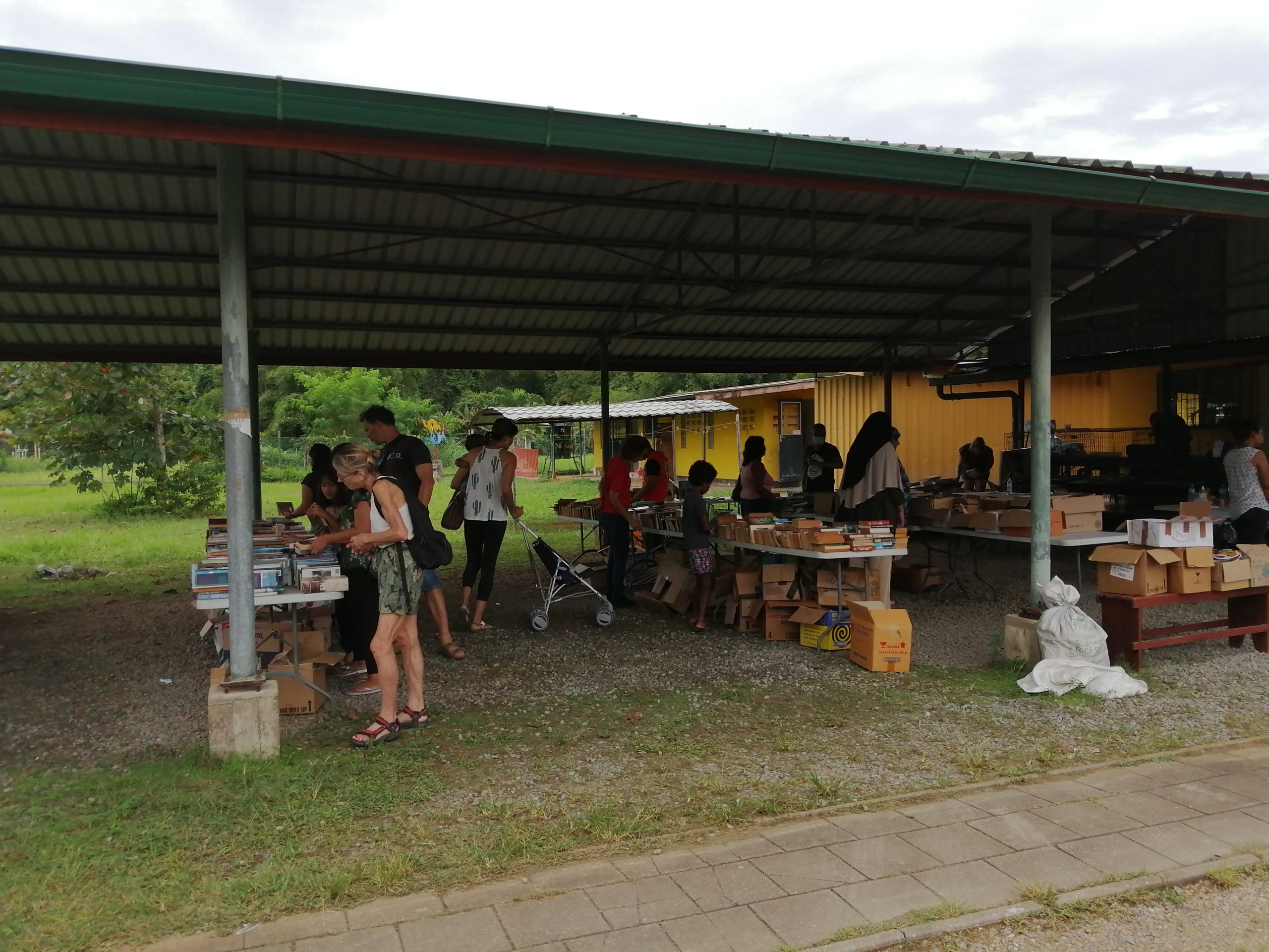 Iets verderop lezen drie jongeren aandachtig wat in de omschrijving op de kaften staat geschreven. Het is een komen en gaan van lezers en de prijzen zijn vanaf SRD 5 voor een boek. Over een maand is er weer een boekenmarkt.