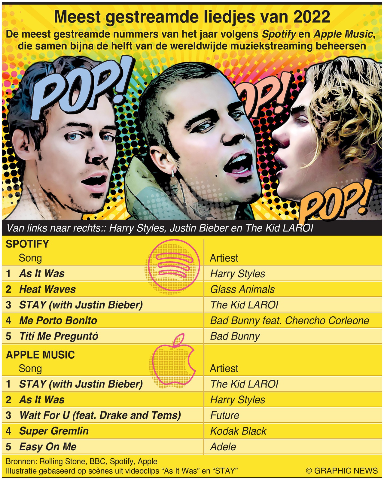 De meest gestreamde nummers van het jaar volgens Spotify en Apple Music, die samen bijna de helft van de wereldwijde muziekstreaming voor hun rekening nemen.