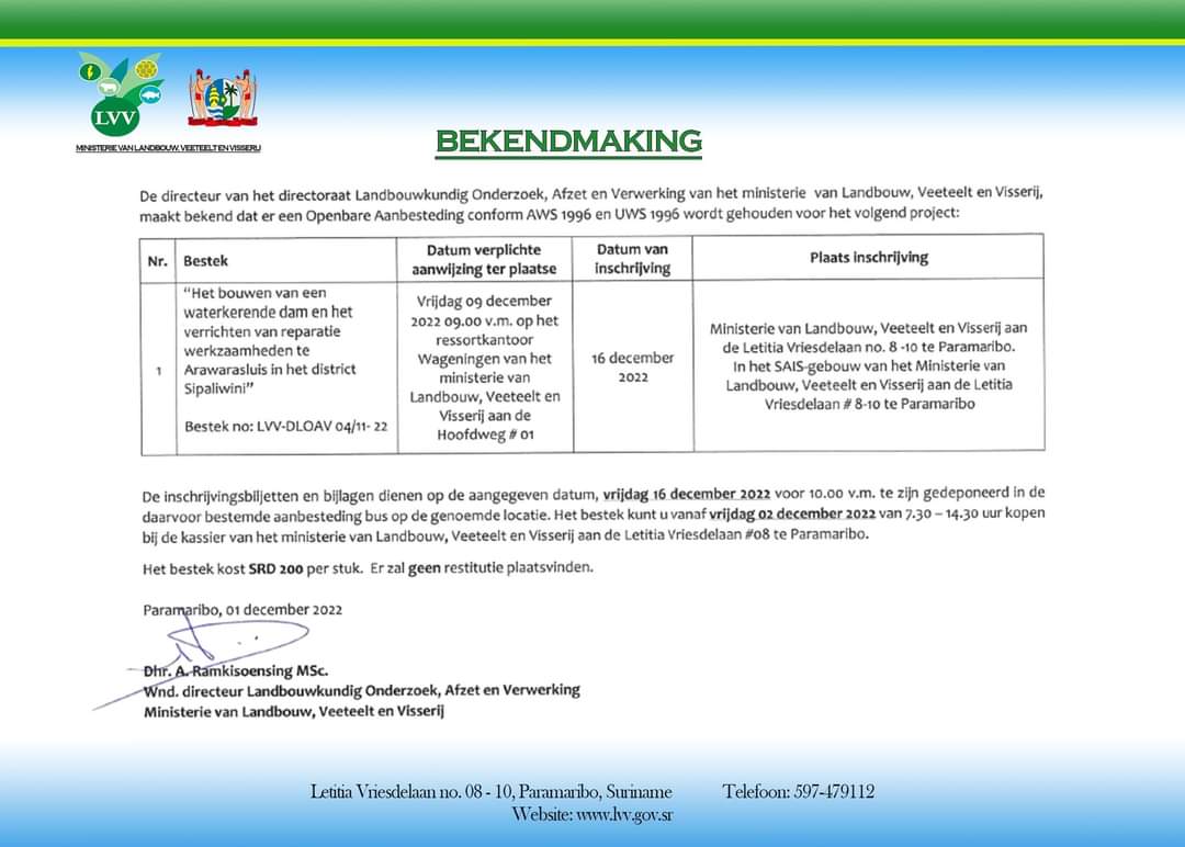 “Enkele maanden terug heeft men een inschrijving gehouden en toen via het ministerie van Landbouw, Veeteelt en Visserij. Daar is toen alles en nog wat mis gegaan. In de Raad van Ministers is er zelfs een gehaal en getrek ontstaan hierover. Nu komt het ministerie van Openbare Werken met nog een inschrijving die op dezelfde manier plaatsvindt zonder enige nuanceverschillen. Het enige dat is veranderd, is de raming die is opgeschroefd om de “njang”(geld) te maken. Dus we kunnen het zien als stuivertje verwisselen. Erger nog, dat nu al bekend is aan wie het werk gegund zal worden. Het zijn allemaal dieven bij elkaar.”