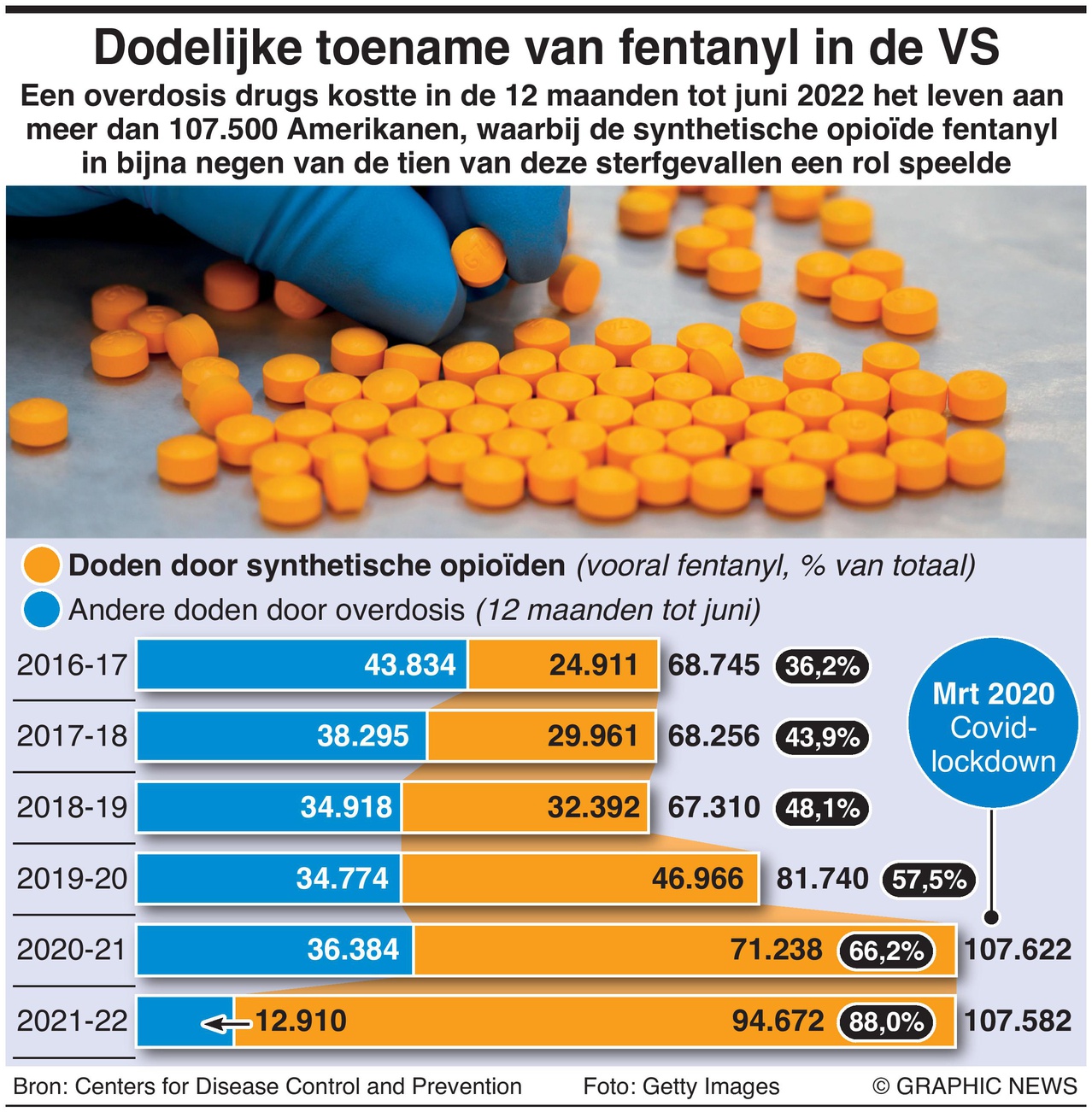 13 december 2022 – Overdosis drugs heeft in de 12 maanden tot juni 2022 aan meer dan 107.500 Amerikanen het leven gekost, waarbij het synthetische opioïde fentanyl een rol speelde bij bijna negen op de tien van deze sterfgevallen.