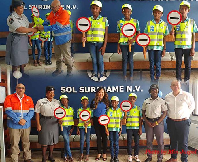 General manager Rick Soedamah van SOL Suriname NV heeft maandag 12 december in het hoofdkantoor van SOL 130 veiligheidsvesten, 120 fluiten, 109 petten en 60 verkeersborden overhandigd aan de coördinator van het verkeersbrigadiertjes project, de onderinspecteur van politie, Nathalie Creton.