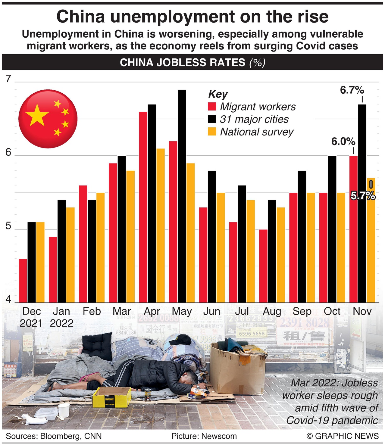 December 15, 2022 – Unemployment in China is worsening, especially among vulnerable migrant workers, as the economy reels from surging Covid cases.