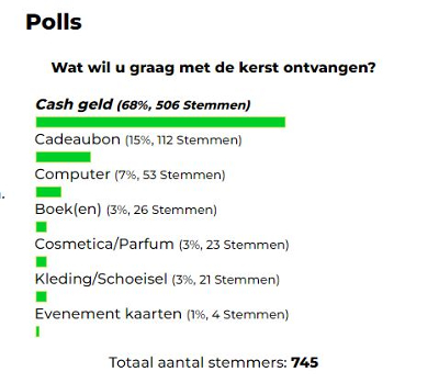 Van de 745 mensen die de poll hebben ingevuld, gaf maar liefst 68 procent (508 personen) cash geld te willen ontvangen. 112 mensen geven de voorkeur aan een cadeaubon (15 procent), 7 procent ofwel 53 personen vinkte de optie computer aan en 26 mensen kozen voor de optie van boek(en). 21 stemmers gaan voor de optie kleding/schoeisel (3 procent) en als laatste blijken slechts vier mensen (1 procent) te hebben gekozen voor een kaartje voor een of ander evenement.