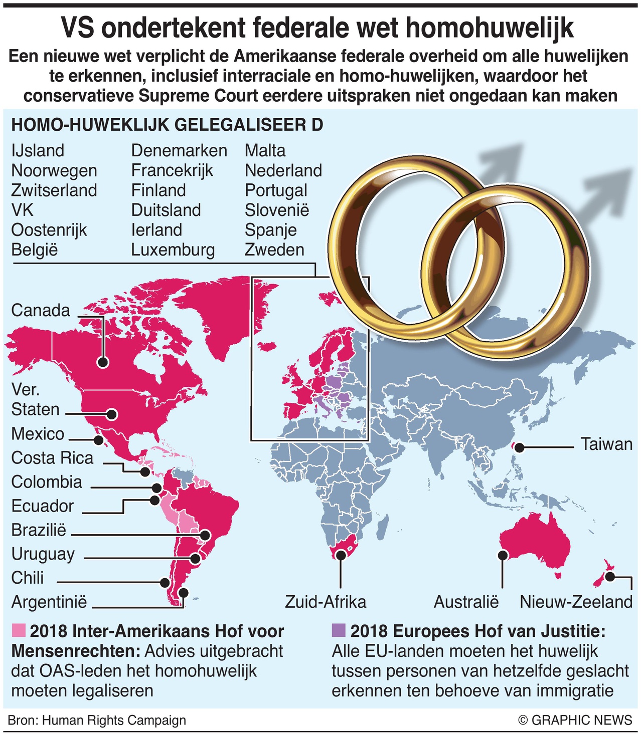14 december 2022 – De Respect for Marriage Act, ondertekend door de Amerikaanse president Joe Biden, vereist dat de federale regering alle huwelijken erkent – inclusief huwelijken tussen mensen van hetzelfde geslacht en huwelijken tussen verschillende rassen – en hen beschermt tegen elke omkering door het conservatief gedomineerde Hooggerechtshof.