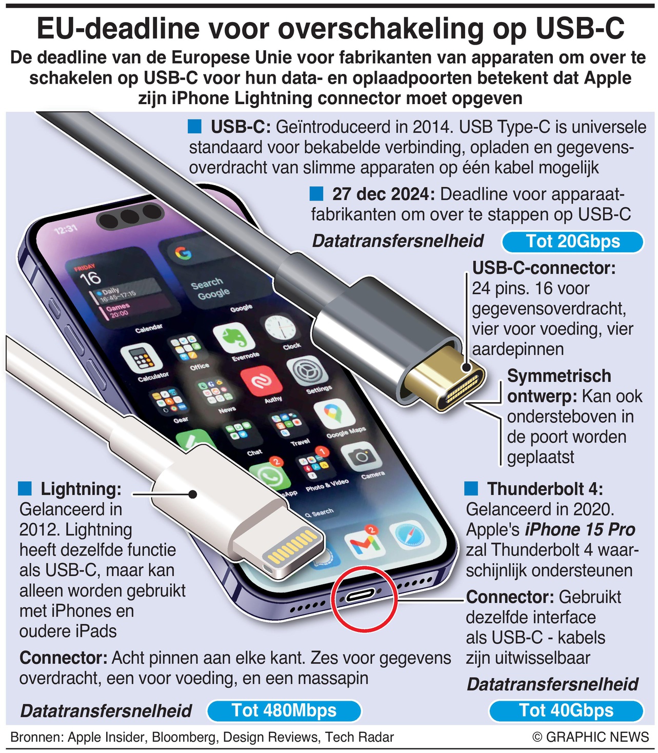 Alle iPhones die in de EU worden verkocht, moeten uiterlijk op 28 december 2024 kunnen worden opgeladen met USB-C-kabels. De wet is gepubliceerd in het Publicatieblad van de EU en is van toepassing op telefoons, tablets, koptelefoons en draagbare gameconsoles.