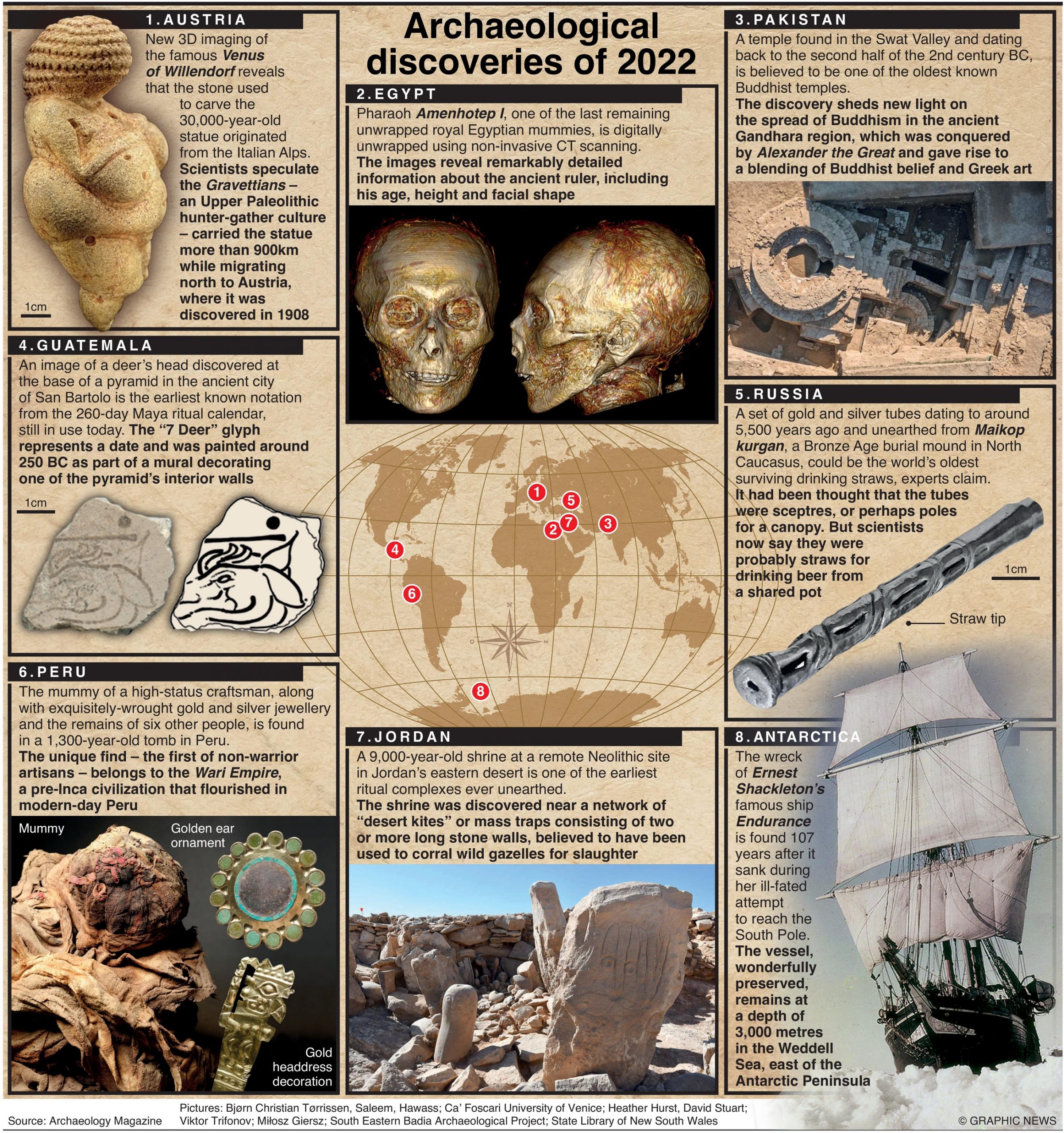 31 december 2022 – ’s Werelds meest opmerkelijke archeologische ontdekkingen in 2022 omvatten nieuwe inzichten in de Venus van Willendorf en de mummie van farao Amenhotep I, de oudste boeddhistische tempel, de vroegste aantekening van de Maya-kalender, de oudste bewaard gebleven rietjes en het wrak van het beroemde schip van Ernest Shackleton, Endurance.