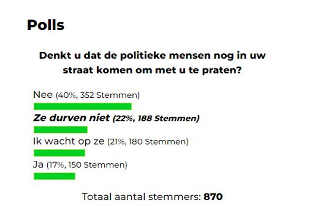 Van de 870 uitgebrachte stemmen heeft 40 procent de vraag met ‘nee’ beantwoord (352 personen). 188 mensen geven aan dat de heren en dames politici het niet durven om met ze in gesprek te gaan (22 procent).