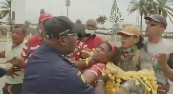 Na een sommatie om zich van de plek te verwijderen, probeerde de heer Sallons een gesprek met de inspecteur te beginnen, maar werd hardhandig aangepakt door de inspecteur. Hierdoor liep hij vooral pijn aan de borst op, zo bevestigt de heer Sallons en ook uit het rapport van de Spoedeisende Hulp blijkt, dat het er toch ernstig aan toe is gegaan. De inheemse Gina Zaalman kreeg een klap in het gezicht en een stoot van de inspecteur van politie (zie screenshot).