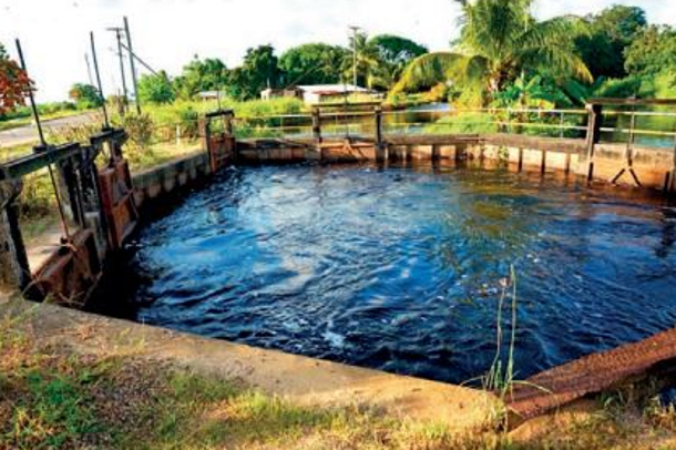 (Foto: Het waterverdeelwerk bij het gemaal te Clara in de westelijke polder in Nickerie. In het kader van het IDB-projekt gericht op duurzame landbouwproduktiviteit zal dit waterwerk een upgrading ondergaan.)