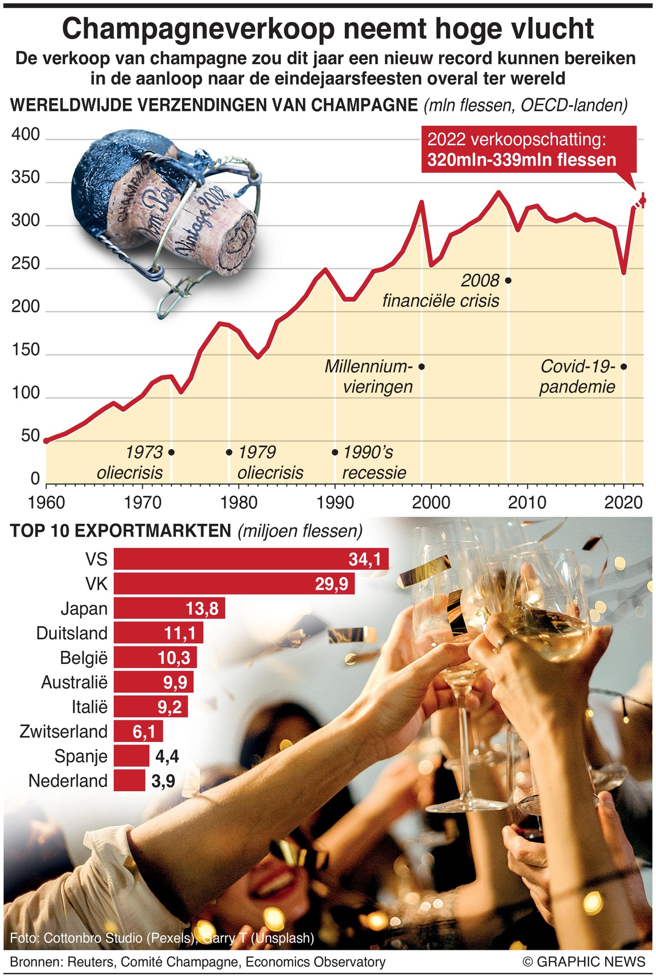 De Unie van Champagnehuizen denkt dat de verkoop in 2022 nog hoger zal liggen, ergens tussen de 320 miljoen en 339 miljoen flessen.