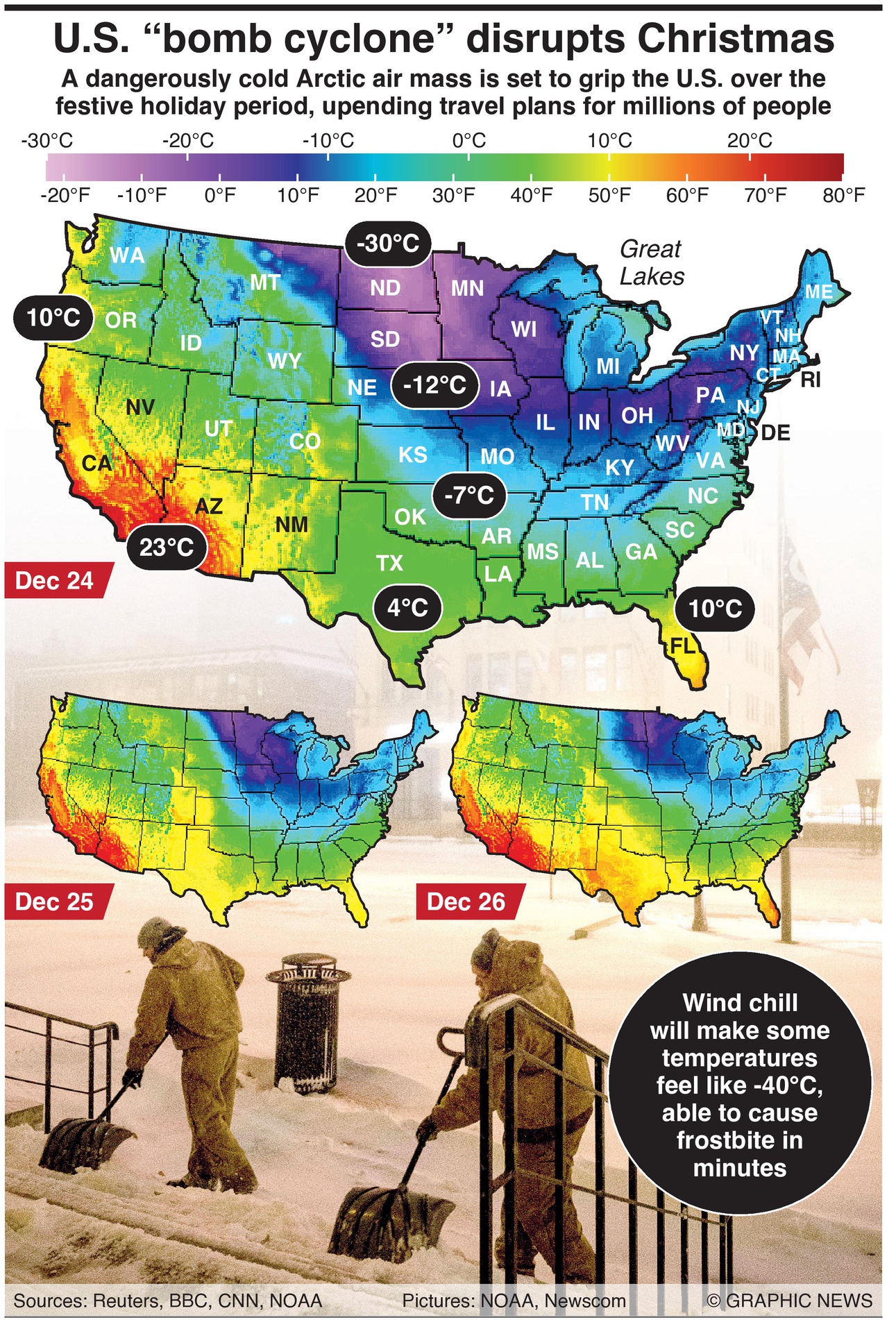 Een ijskoude storm, bekend als een “bomcycloon”, is neergedaald over de Verenigde Staten en lijkt de reisplannen van miljoenen mensen in een van de drukste tijden van het jaar – Kerstmis – te verpesten.