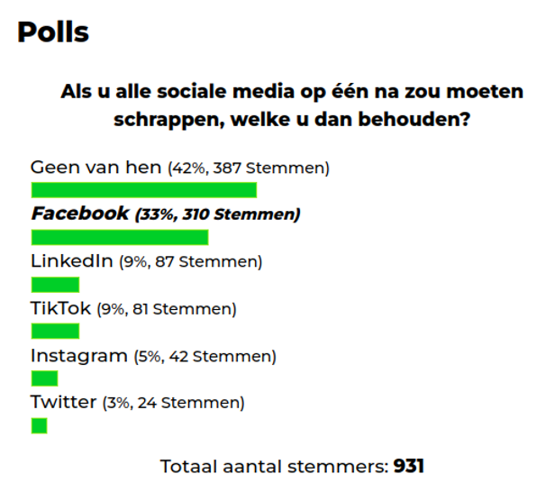 310 stemmers (33%) geven aan dat zij Facebook zouden behouden, 9 procent (87 personen) zou kiezen voor LinkedIn, 42 mensen gaan voor Instagram (5 procent) en slechts 3 procent (24 personen) zou Twitter willen behouden.