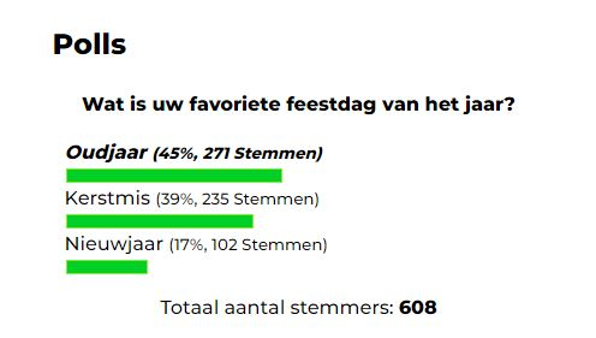 In de poll die door Dagblad Suriname werd gepubliceerd kozen 271 mensen uit de 608 totaal voor het oudejaarsfeest als hun favoriete feestdag. Dat komt op zo’n 45% van het totaal aantal stemmen. Een hoog aantal, maar jammer genoeg niet zoveel als de winnende groep stemmers, 235 stemmen, die kozen voor het kerstfeest. Dat aantal stemmen vormt 39% van het aantal stemmen dat overbleef. 102 stemmers kozen voor het nieuwjaarsfeest en dat komt op een percentage van 17%. Al met al kan gezegd worden dat vanaf het kerstfeest mensen naar het nieuwe jaar toe in de stemming zijn om gezellig met elkaar het jaar af te sluiten en weer van start te gaan in een nieuw kalenderjaar.