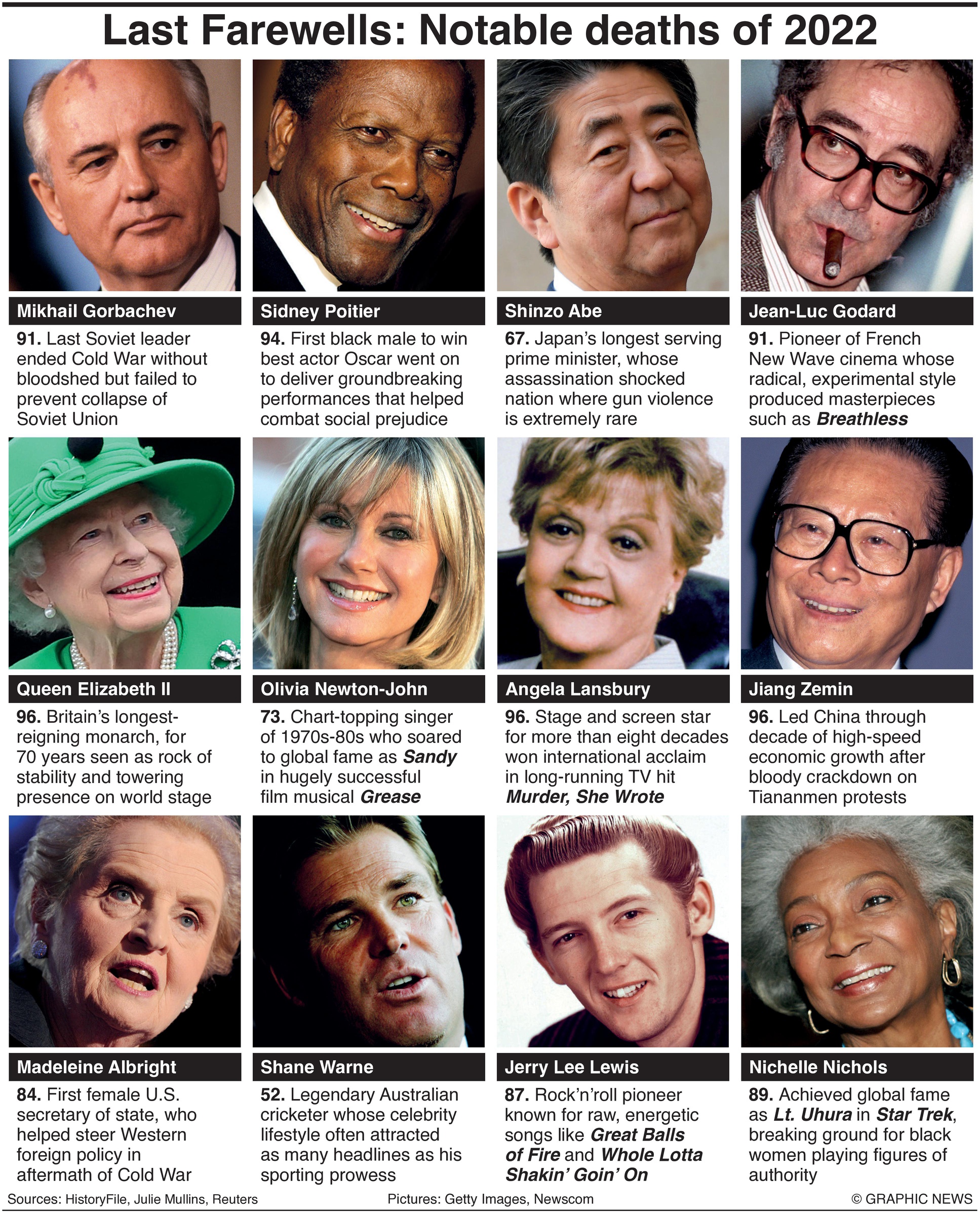 31 december 2022 – Een kleine selectie van beroemde figuren die in 2022 stierven, zijn onder meer koningin Elizabeth II, voormalige wereldleiders Michail Gorbatsjov, de laatste Sovjet-president, Shinzo Abe uit Japan en Jiang Zemin uit China, plus Madeleine Albright, de eerste vrouwelijke Amerikaanse secretaris van staat. De kunstwereld verloor filmregisseur Jean-Luc Godard, acteurs Sidney Poitier, Angela Lansbury en Nichelle Nicholls, zangers Olivia Newton-John en Jerry Lee Lewis, terwijl sportfans rouwden om het verlies van de Australische cricketlegende Shane Warne.