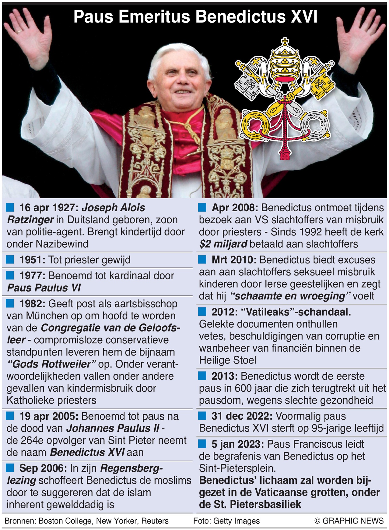 3 januari 2023 – Het lichaam van emeritus paus Benedictus XVI, die zaterdag stierf, zal opgebaard liggen in de Sint-Pietersbasiliek tot de begrafenis van donderdagochtend, die paus Franciscus zal leiden op het Sint-Pietersplein.