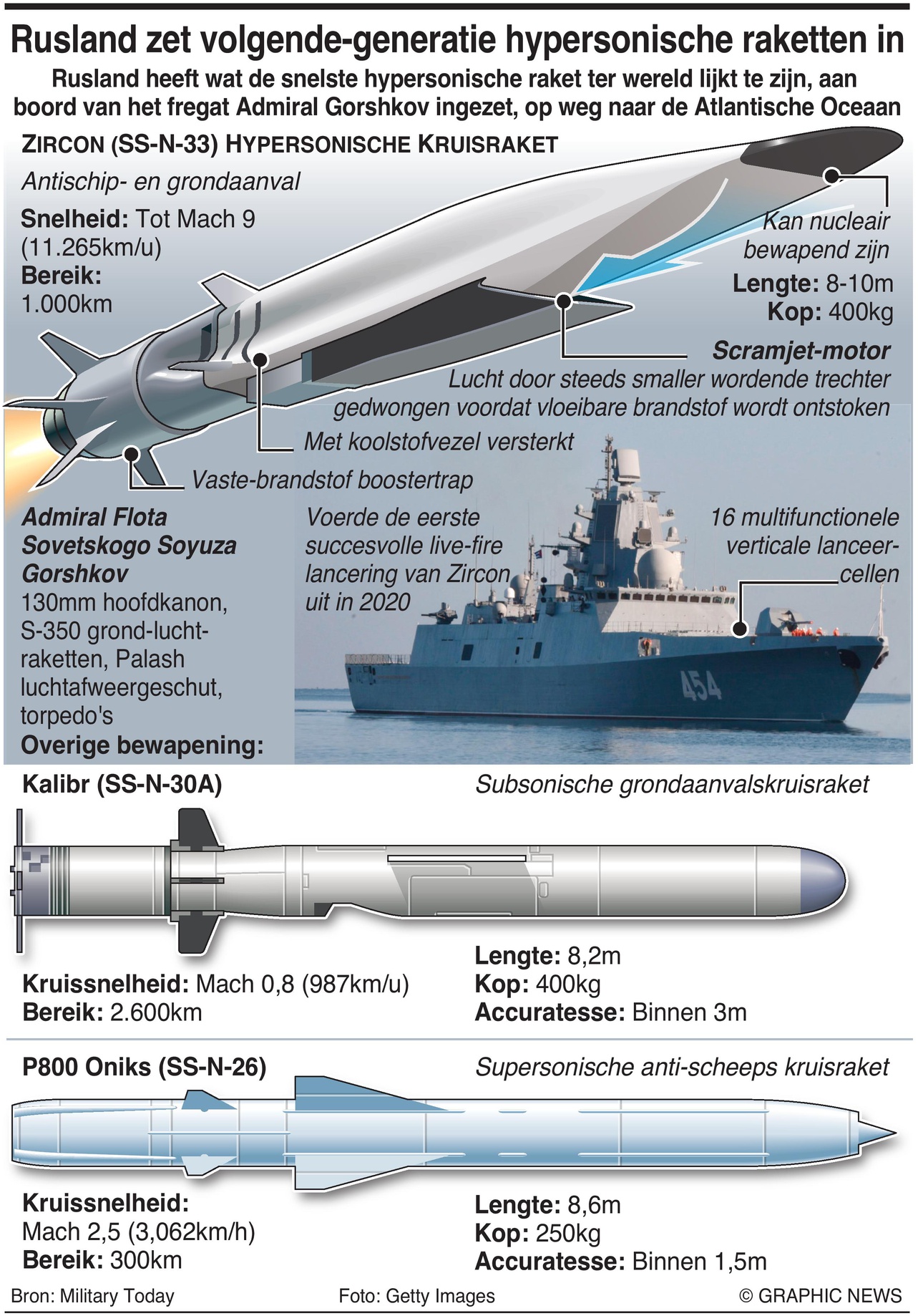 Vladimir Poetin heeft een fregat, gewapend met hypersonische Zircon-kruisraketten, naar de Atlantische Oceaan gestuurd. Dat heeft de Russische president gezegd tijdens een videoconferentie met minister van Defensie Sergej Sjojgoe en de commandant van het fregat, meldt persbureau Reuters.