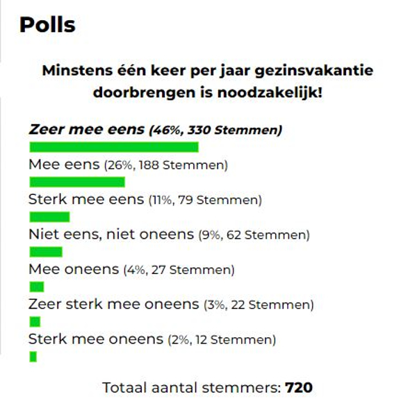 Van de 720 uitgebrachte stemmen gaven in totaal 597 personen het met de stelling in de poll eens te zijn. Slechts 61 personen hebben aangevinkt het niet eens te zijn met de stelling, 62 mensen hebben de optie āniet eens, niet oneensā aangevinkt.