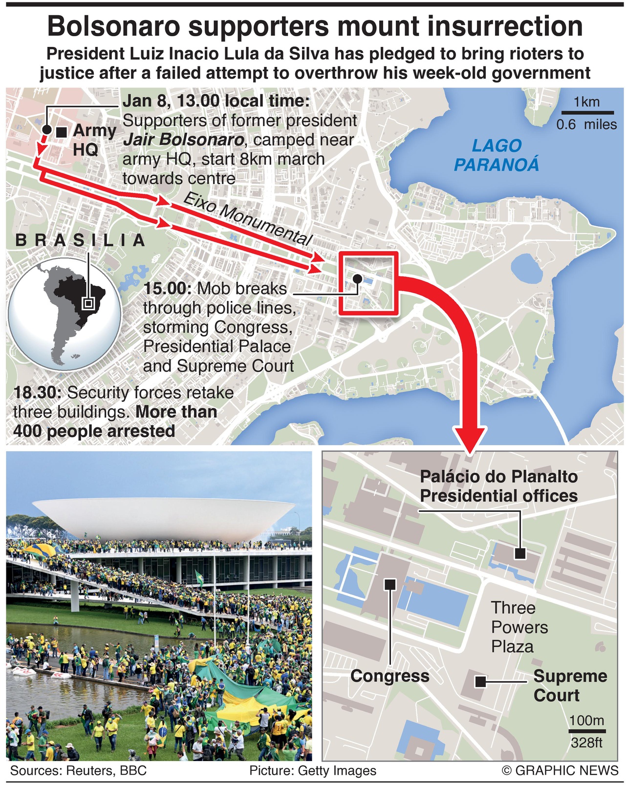 In de Braziliaanse hoofdstad Brasilia hebben duizenden aanhangers van de voormalige president Jair Bolsonaro zondag het parlementsgebouw bestormd, omdat ze zich weigeren neer te leggen bij diens verkiezingsnederlaag. Elders in de stad drongen relschoppers ook het presidentieel paleis en het Hooggerechtshof binnen. De Braziliaanse veiligheidstroepen hebben de controle over de gebouwen inmiddels heroverd. Bolsonaro heeft de bestorming door zijn aanhangers veroordeeld, zeker 200 relschoppers werden opgepakt.