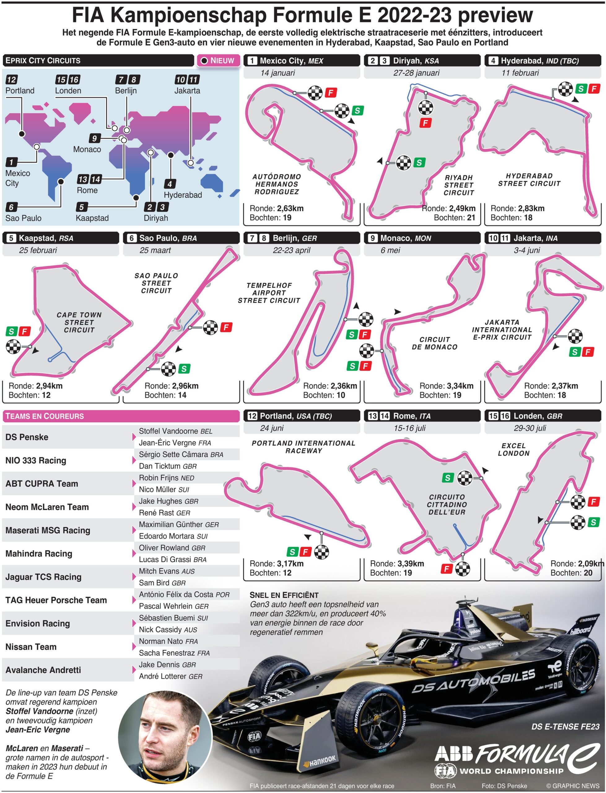14 januari 2023 – 30 juli 2023 – Het negende FIA Formule E-kampioenschap, de eerste volledig elektrische eenzitter straatraceserie, introduceert de Formule E Gen3-auto en biedt vier nieuwe evenementen in Hyderabad, Kaapstad, Sao Paulo en Portland.