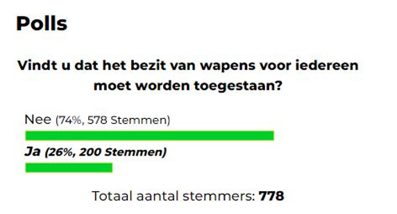 Dagblad Suriname vroeg haar lezers online via een poll of het bezit van vuurwapens voor iedereen moet worden toegestaan. Het merendeel geeft aan, dat dit niet voor een ieder toegestaan zou moeten worden. Van de 778 stemmers hebben 578 personen (74%) de optie ‘Nee’ aangevinkt. Volgens 200 personen (26%) zou het bezit van wapens wel toegestaan moeten worden.