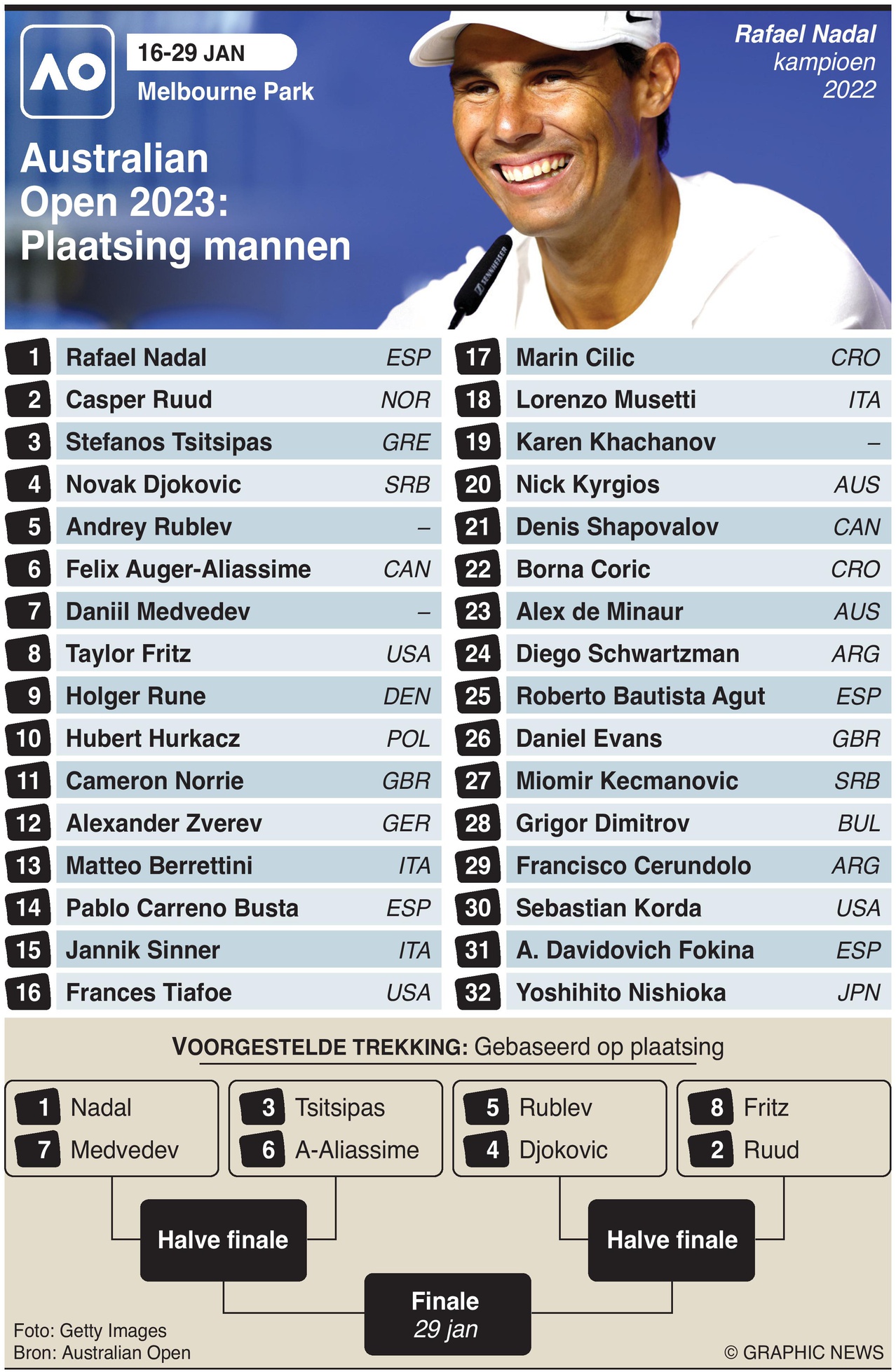 16 januari 2023 – 29 januari 2023 – De Australian Open, het eerste Grand Slam-toernooi van het seizoen, vindt plaats in Melbourne. Titelverdediger Rafael Nadal is kopman bij de mannen voor de Australian Open en zal naar verwachting in de kwartfinales het opnemen tegen nr. 7 reekshoofd Daniil Medvedev. De Spanjaard zou in de finale langdurige rivaal Novak Djokovic kunnen treffen.
