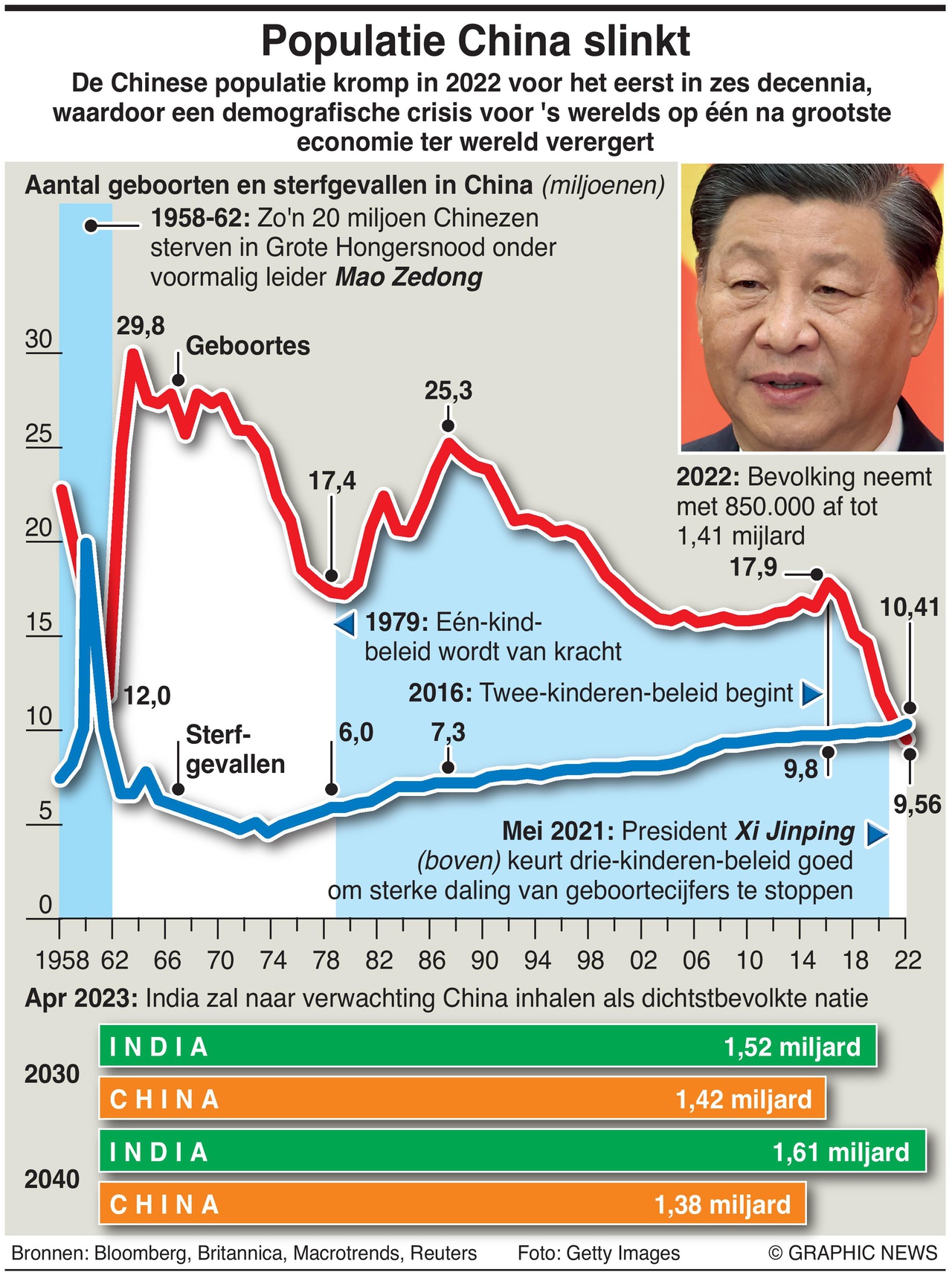China telde eind vorig jaar 1,41175 miljard inwoners. Dat zijn er 850.000 minder dan een jaar eerder, meldt het nationale bureau voor de statistiek. Het staat nu vast dat India in de loop van dit jaar China zal voorbijsteken.