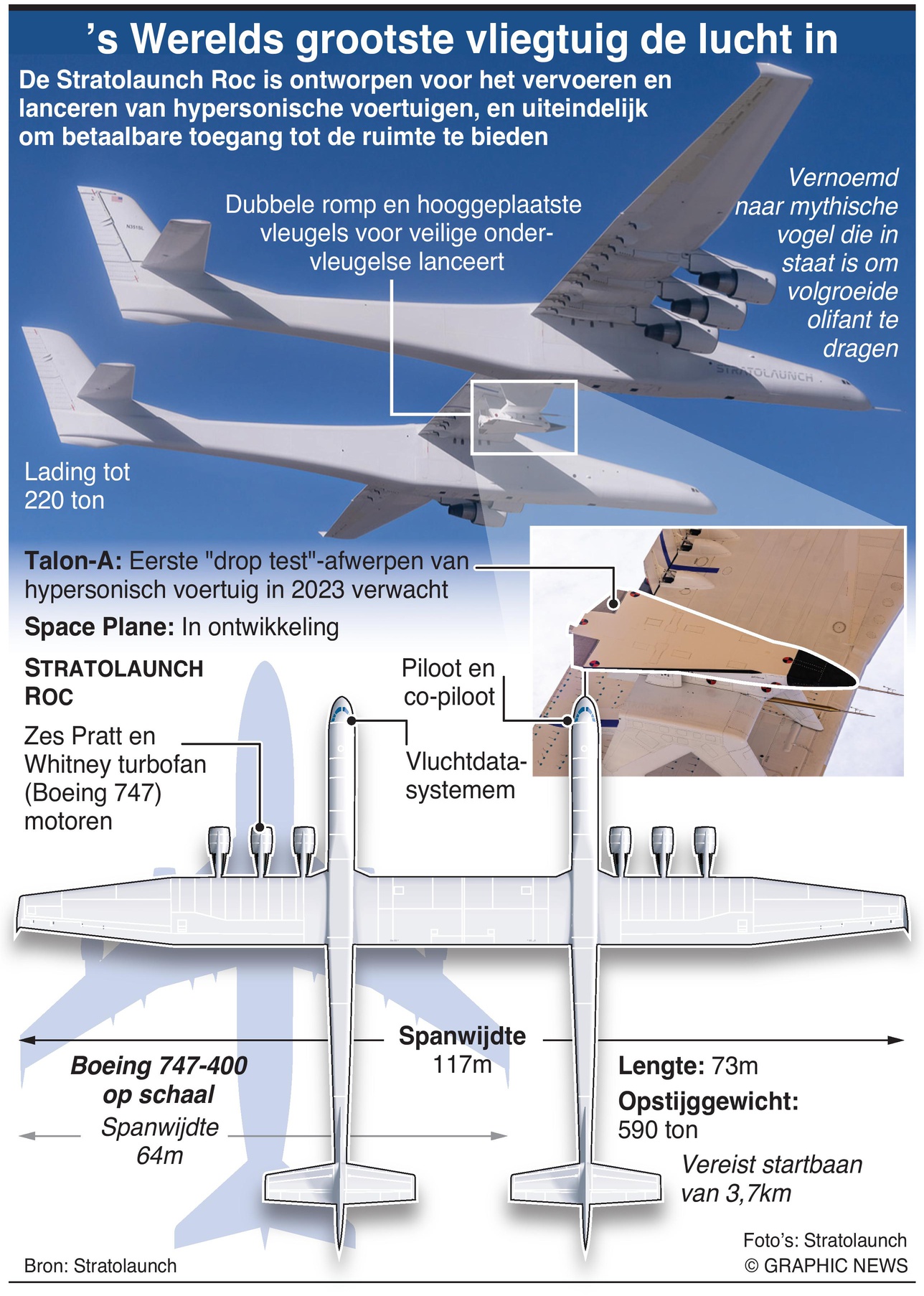 Stratolaunch, een bedrijf van Microsoft-medeoprichter Paul Allen, zijn zevende geslaagde testvlucht uit met de zesmotorige mastodont ‘Roc’. Het vliegtuig weegt 227.000 kilogram en kent een spanwijdte van 117 meter.