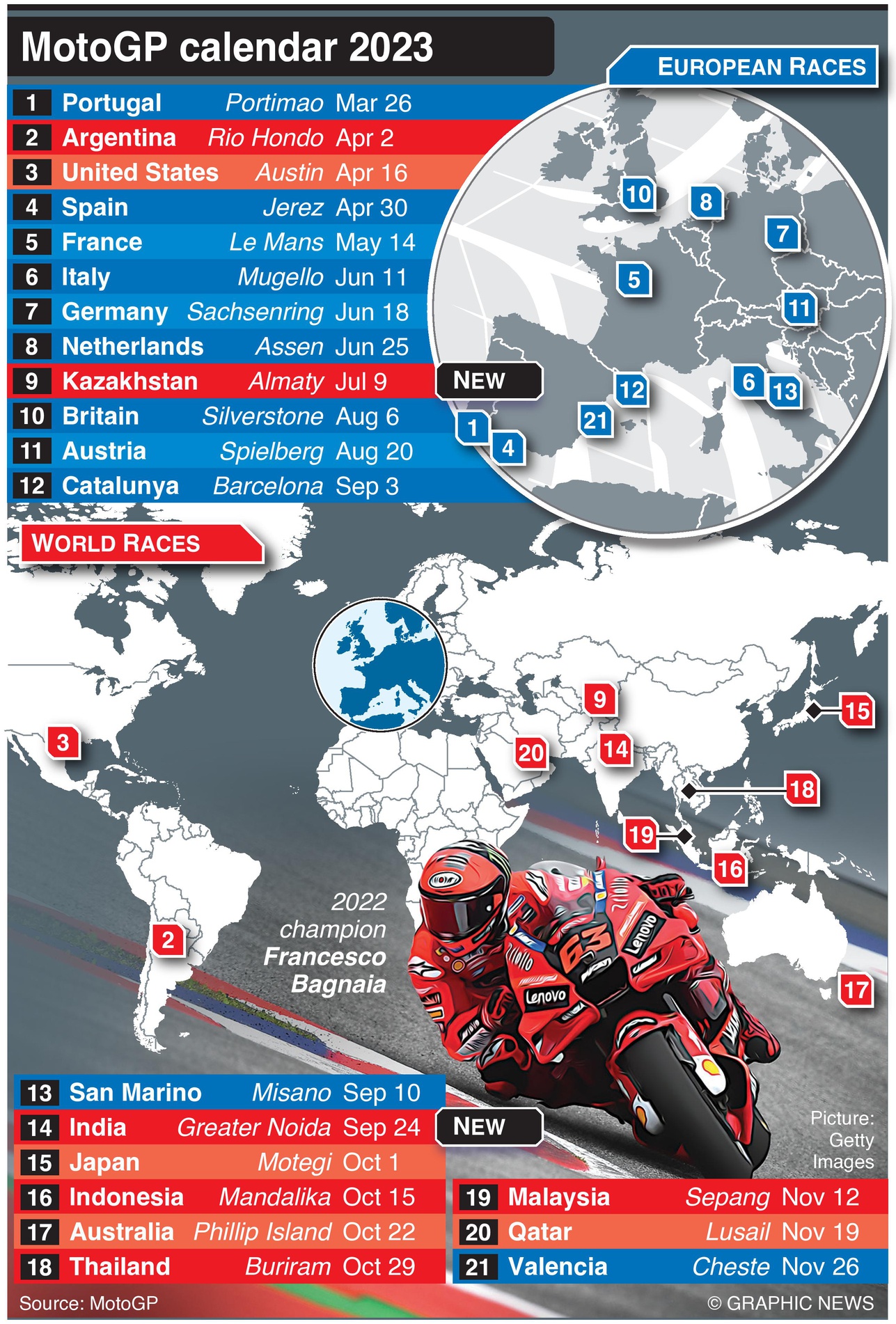 26 maart 2023 – 26 november 2023 – Het MotoGP-seizoen 2023 omvat 21 Grands Prix, te beginnen met de Portugese GP in maart en eindigend in Valencia, Spanje, in november.