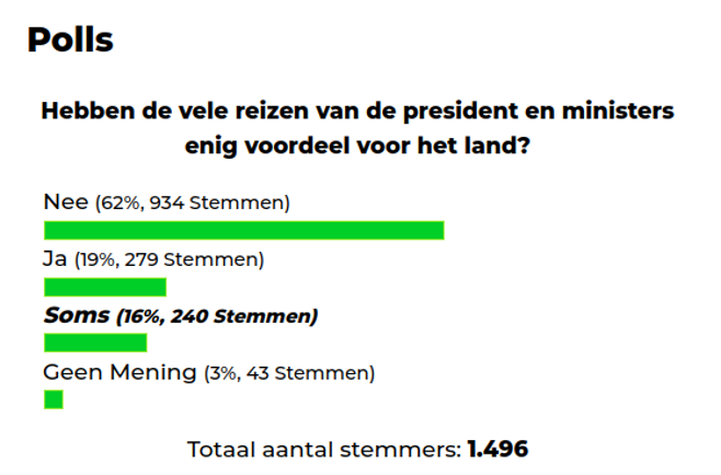 De poll werd ingevuld door 1.496 personen. Daarvan hebben 934 personen op de vraag āhebben de vele reizen van de president en ministers enig voordeel voor het land?ā de optie āNeeā aangevinkt, 62 procent. Volgens 297 stemmers hebben die reizen juist wel enig voordeel voor het land (19%), 240 mensen – 16 procent – hebben de optie āSomsā aangevinkt en slechts 43 personen blijken geen mening over dit issue te hebben ( procent).