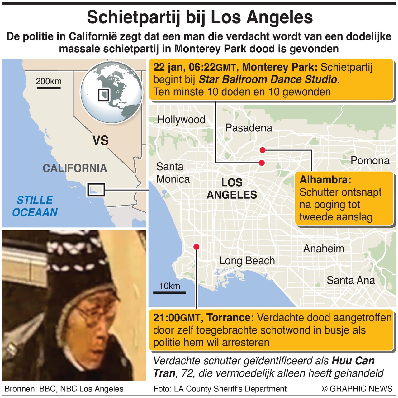 . Er werden in totaal 42 kogels afgevuurd in Monterey Park en er vielen 11 doden.