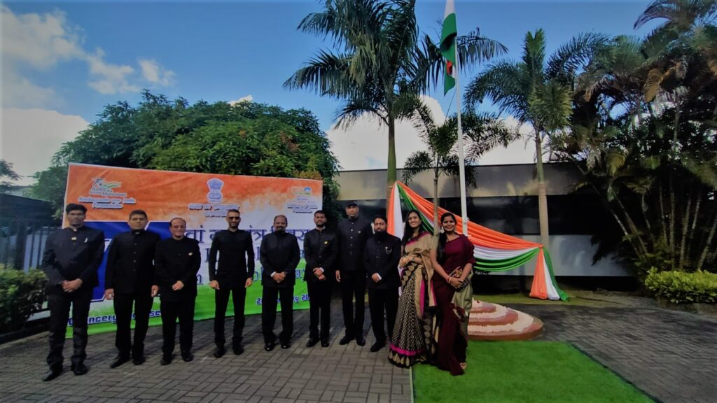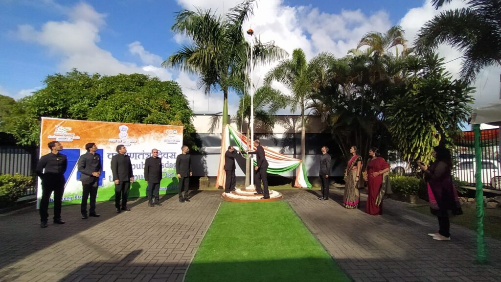 De viering, gehouden in het Chancery-gebouw, begon met het hijsen van de nationale vlag door de ambassadeur van India dr Shankar Balachandran, gevolgd door het zingen van het volkslied.
