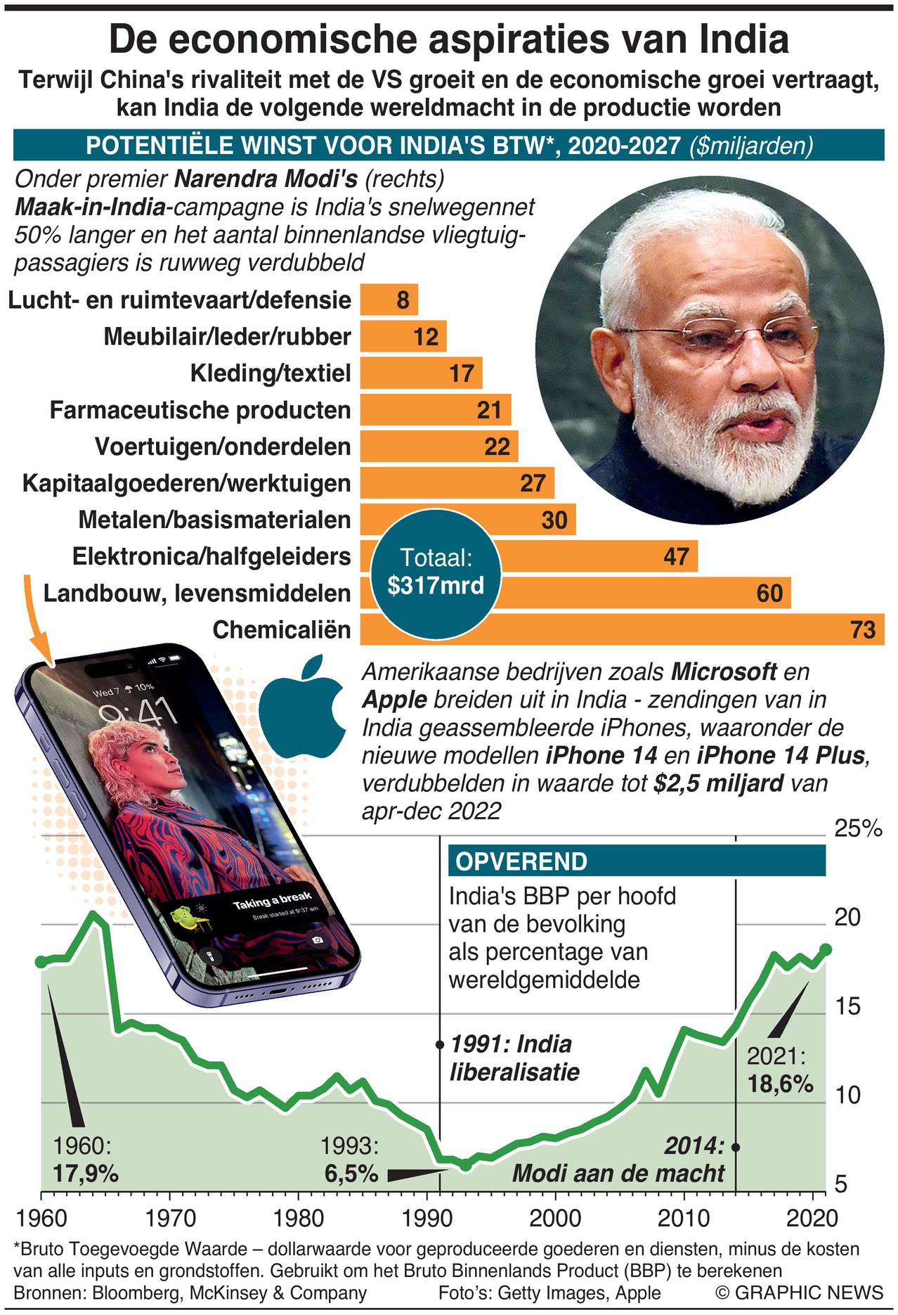 Sinds de verkiezingsoverwinning van premier Narendra Modi in 2014, geholpen door zijn “Make in India”-campagne, is het Indiase snelwegennet 50% langer geworden en is het aantal binnenlandse vliegtuigpassagiers ruwweg verdubbeld.
