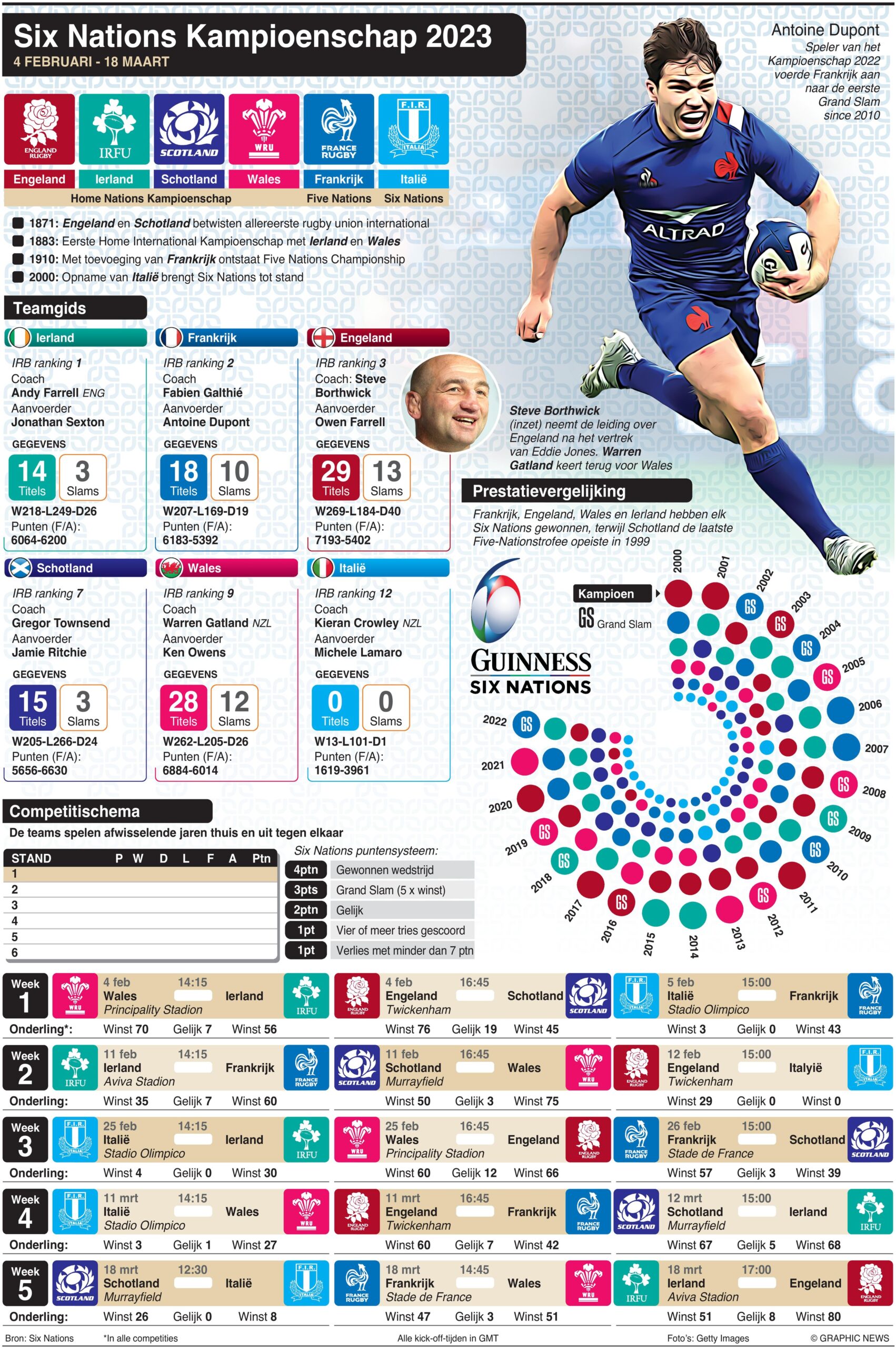 4 februari 2023 – 18 maart 2023 – Het Six Nations Championship 2023. Regerend kampioen Frankrijk begint hun titelverdediging tegen Italië in het Stadio Olimpico in Rome, terwijl het belangrijkste rugbytoernooi van het noordelijk halfrond van start gaat.
