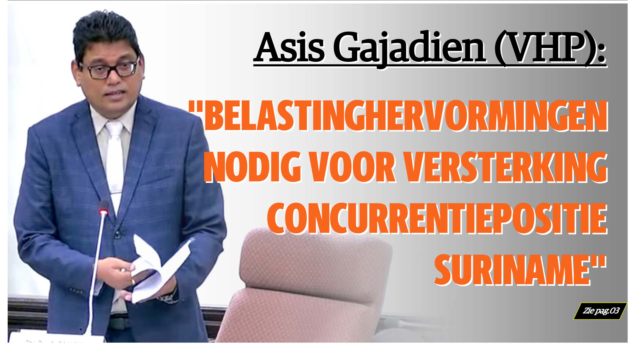 VHP-fractieleider Asis Gajadien wenst spoedig van de regering te vernemen welke zaken zij dit jaar in het kader van de belastinghervormingen zal aanpakken. Het gaat om wijzigingen van de verschillende soorten van belastingen die niet alleen ertoe moeten leiden dat de Staat meer inkomsten binnenkrijgt, maar ook de concurrentiepositie van het land versterkt ten opzichte van landen in de regio, met name Guyana. Door middel van verbeteringen in het belastingstelsel moet het land aantrekkelijk gemaakt worden voor met name buitenlandse investeringen.