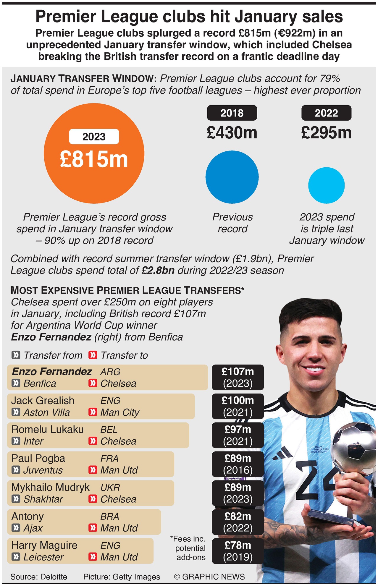 1 februari 2023 – 28 mei 2023 – Premier League-clubs hebben een recordbedrag van £ 815 miljoen (€ 922 miljoen) uitgegeven in een ongekende transferperiode in januari, waarin Chelsea het Britse transferrecord brak op een hectische deadline-dag.