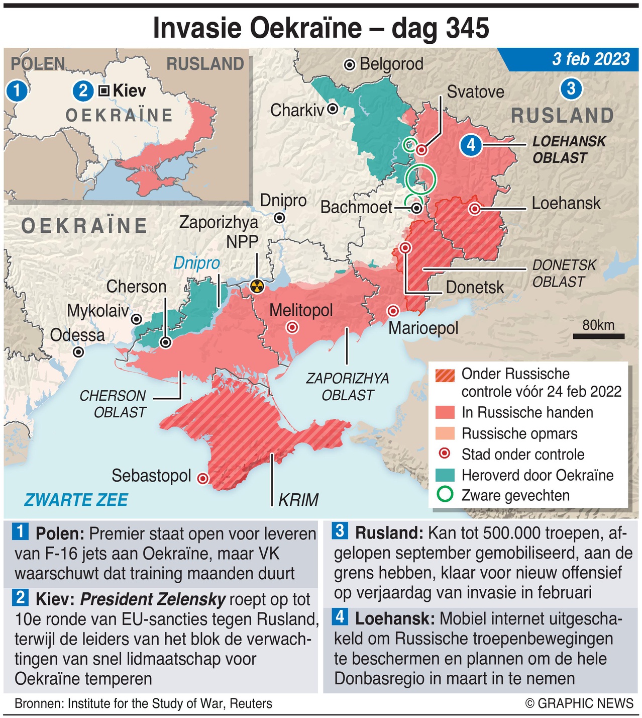 De minister van Buitenlandse Zaken van Oekraïne heeft beweerd dat Rusland mogelijk tot 500.000 troepen heeft, die afgelopen september aan de grens zijn gemobiliseerd, klaar voor een verwacht offensief op de verjaardag van de invasie in februari. Mobiel internet in het bezette Loehansk werd uitgeschakeld om Russische troepenbewegingen en troepenconcentraties te verhullen die in het verleden door Oekraïners in het gebied zijn onthuld.